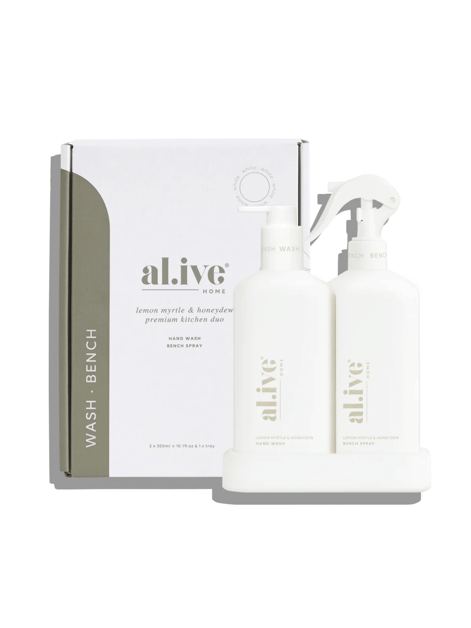 The al.ive body Bench Spray & Dishwashing Liquid Premium Kitchen Duo is a beautiful yet practical product, elegantly packaged to elevate your countertop
