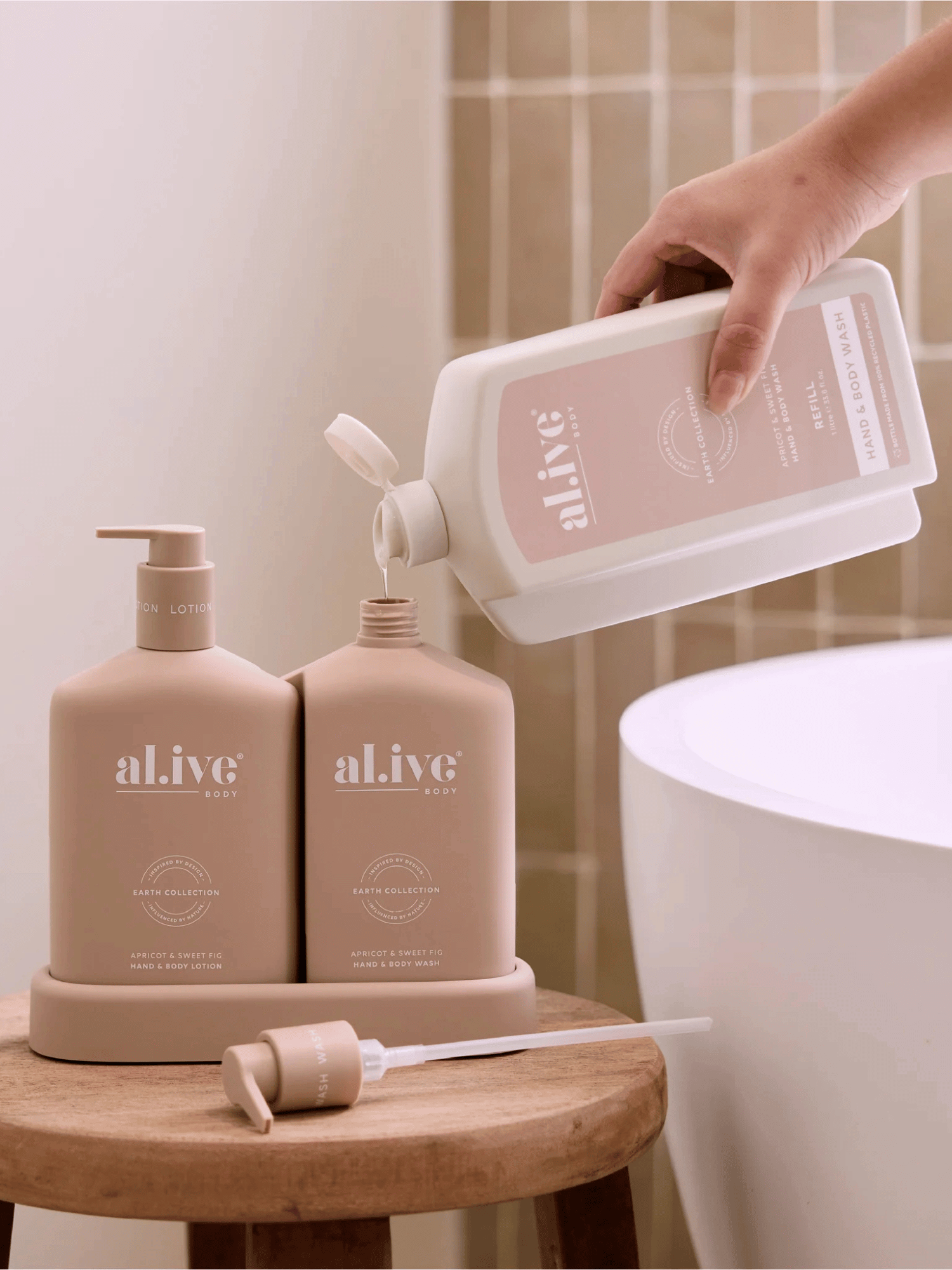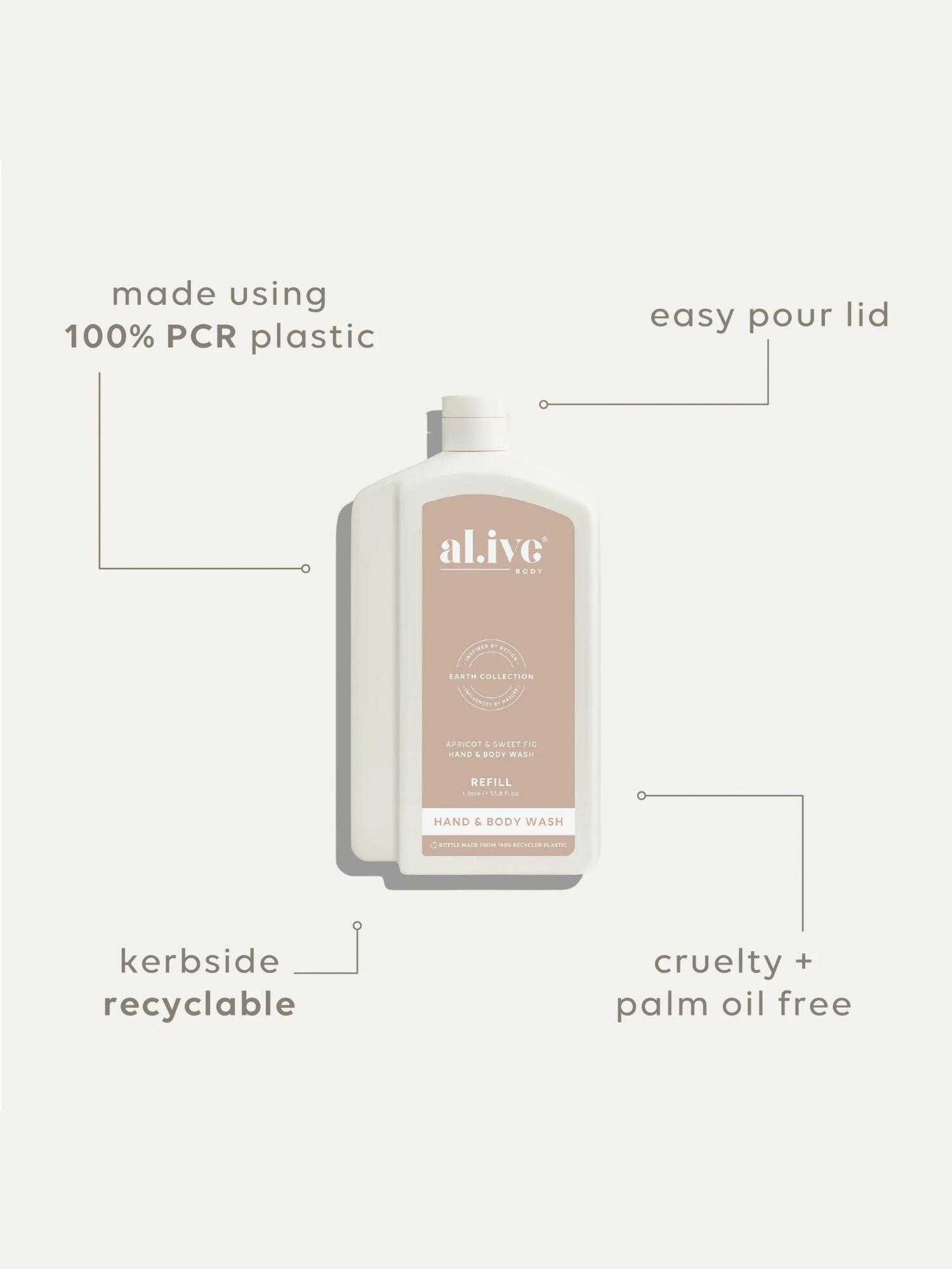 Each refill is designed to refill the 500ml al.ive body Hand & Body Wash bottle twice. With a controlled-flow spout for mess-free pouring, compact shape for easy storage, and full kerbside recyclability, it offers a practical, premium solution while extending the life of the product you already love.
