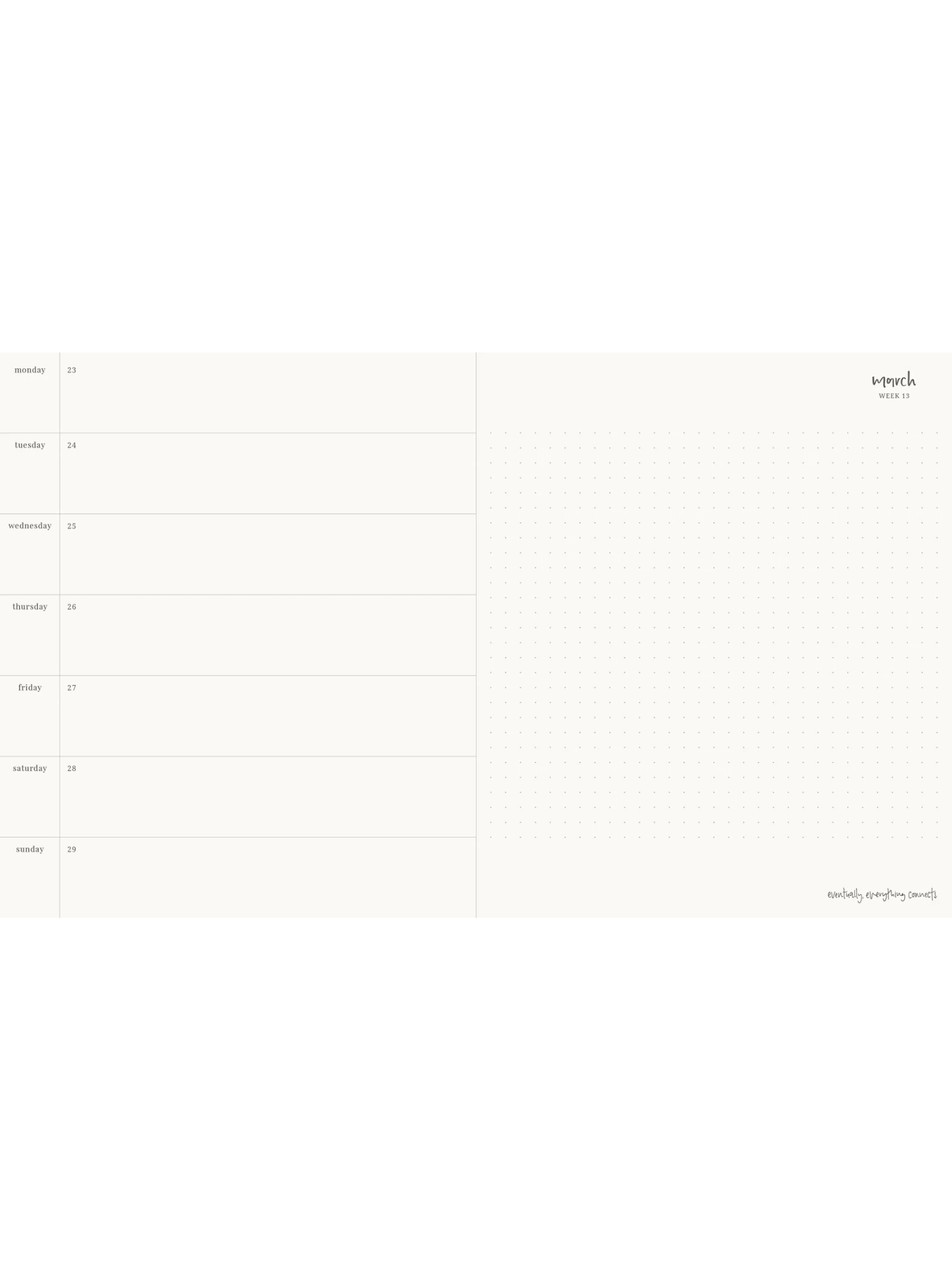 - 29 dot grid pages, for sketching, note-taking or bullet journalling [positioned all together, at the back of planner]