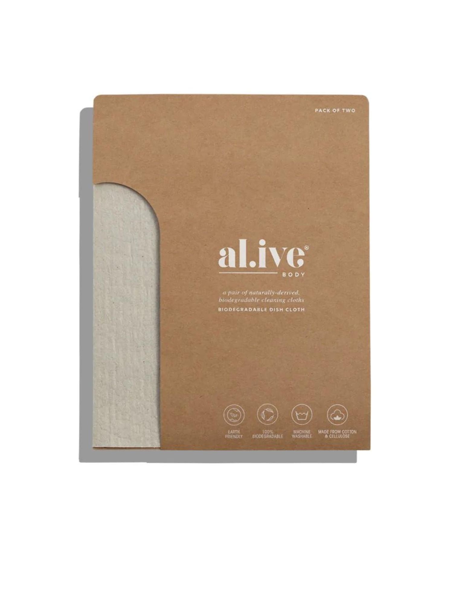 The al.ive body Dish Cloth set includes a pair of naturally-derived, biodegradable cleaning cloths.