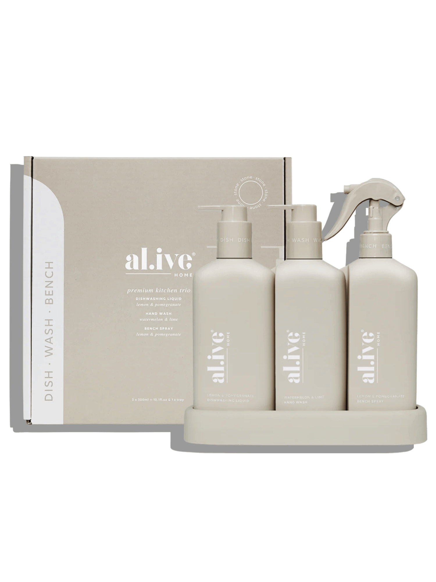The al.ive body Dishwashing Liquid, Hand Wash & Bench Spray + Tray Premium Kitchen Trio is a beautiful yet practical product,  elegantly packaged to elevate your countertop.