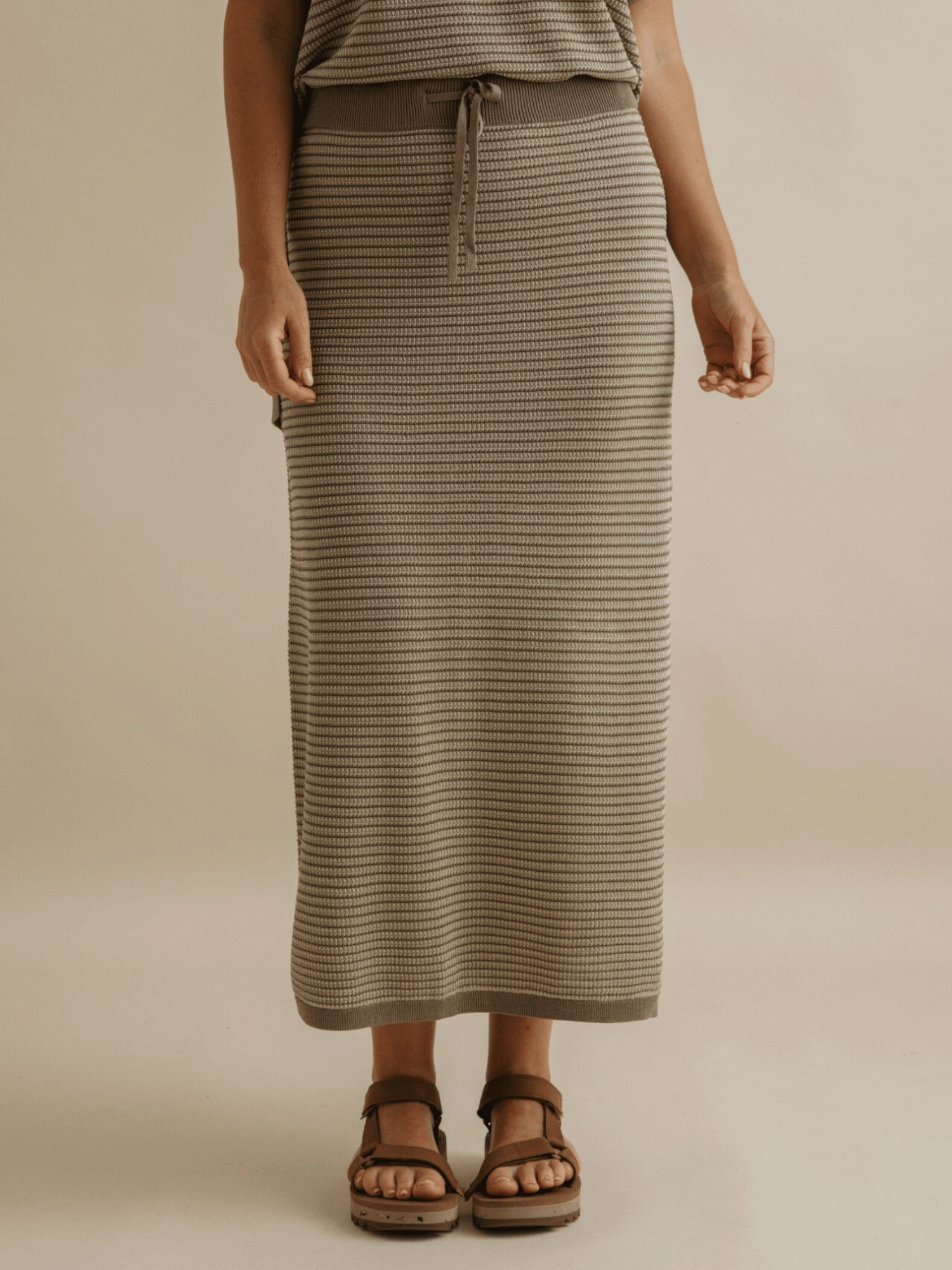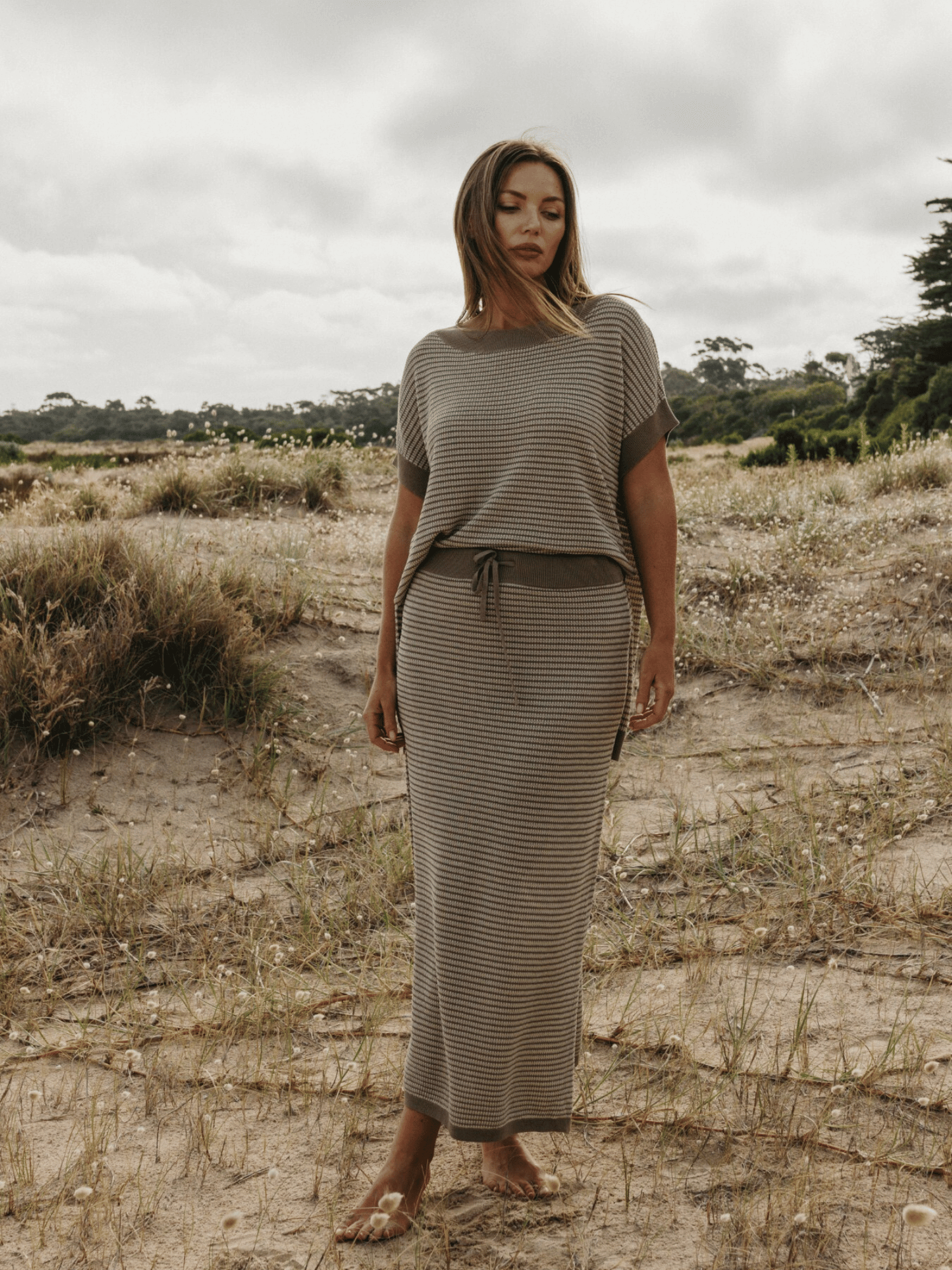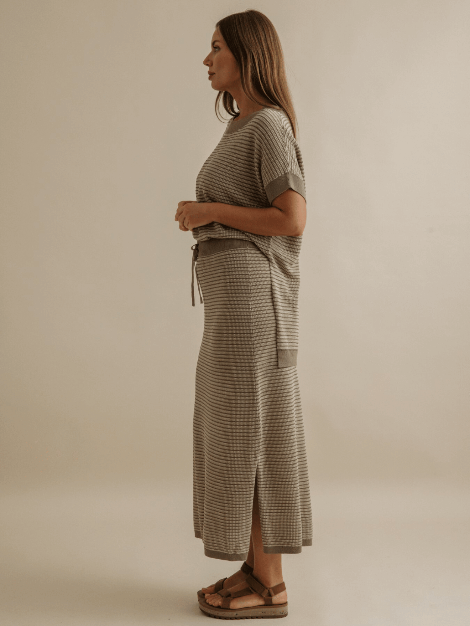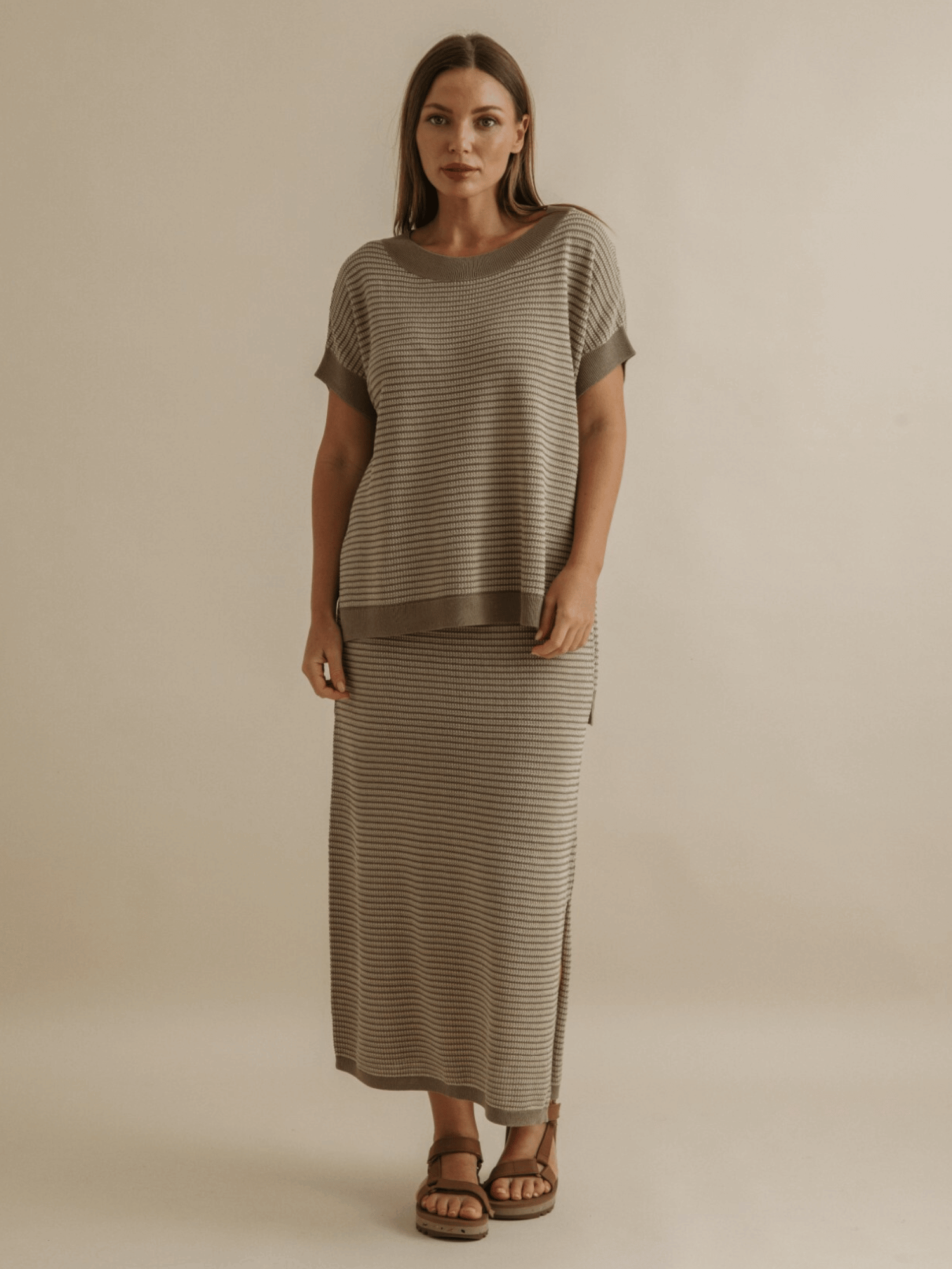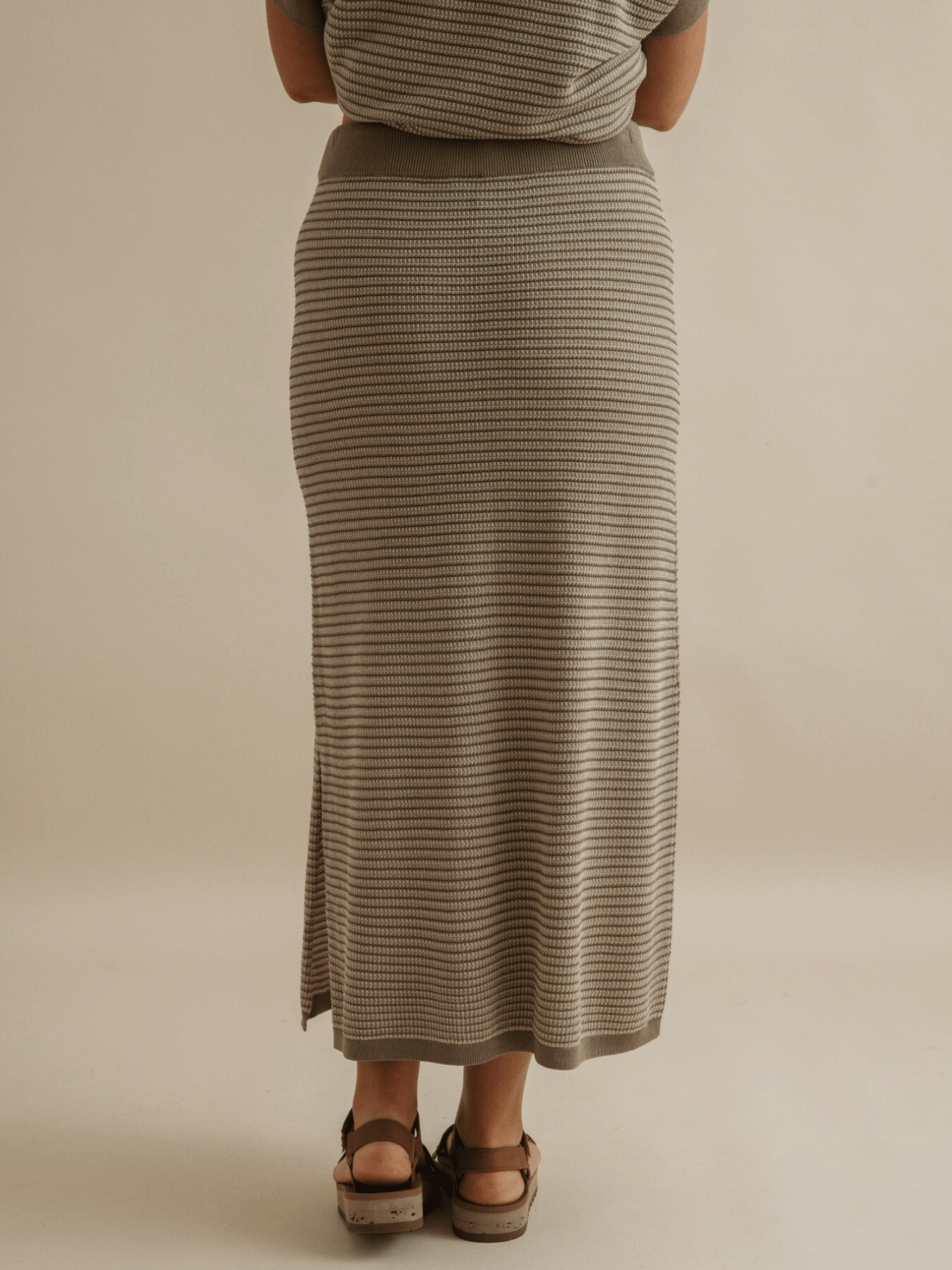 Crafted in a contrasting jacquard knit with soft, textured stripes, it moves effortlessly—graceful but never too polished. Wear it with the matching top for a look that says “I planned this” or with a worn-in tee for that perfectly unplanned charm. Lightweight, wrinkle-proof, easy to care for, and endlessly wearable, it’s the kind of piece that makes you feel at home, no matter where you are.