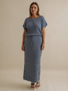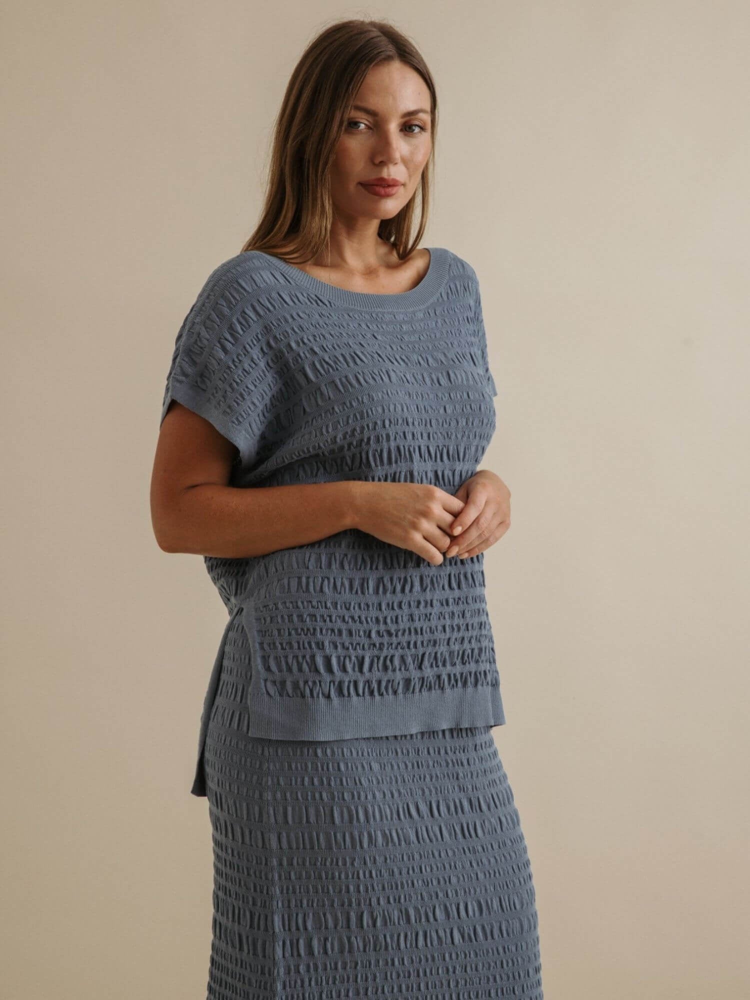 This pullover gives a subtle wave-like knit pattern ripples across the fabric, bringing texture and movement to a timeless silhouette. Blending fabrics keep it structured but easy and drapes beautifully over the body.
