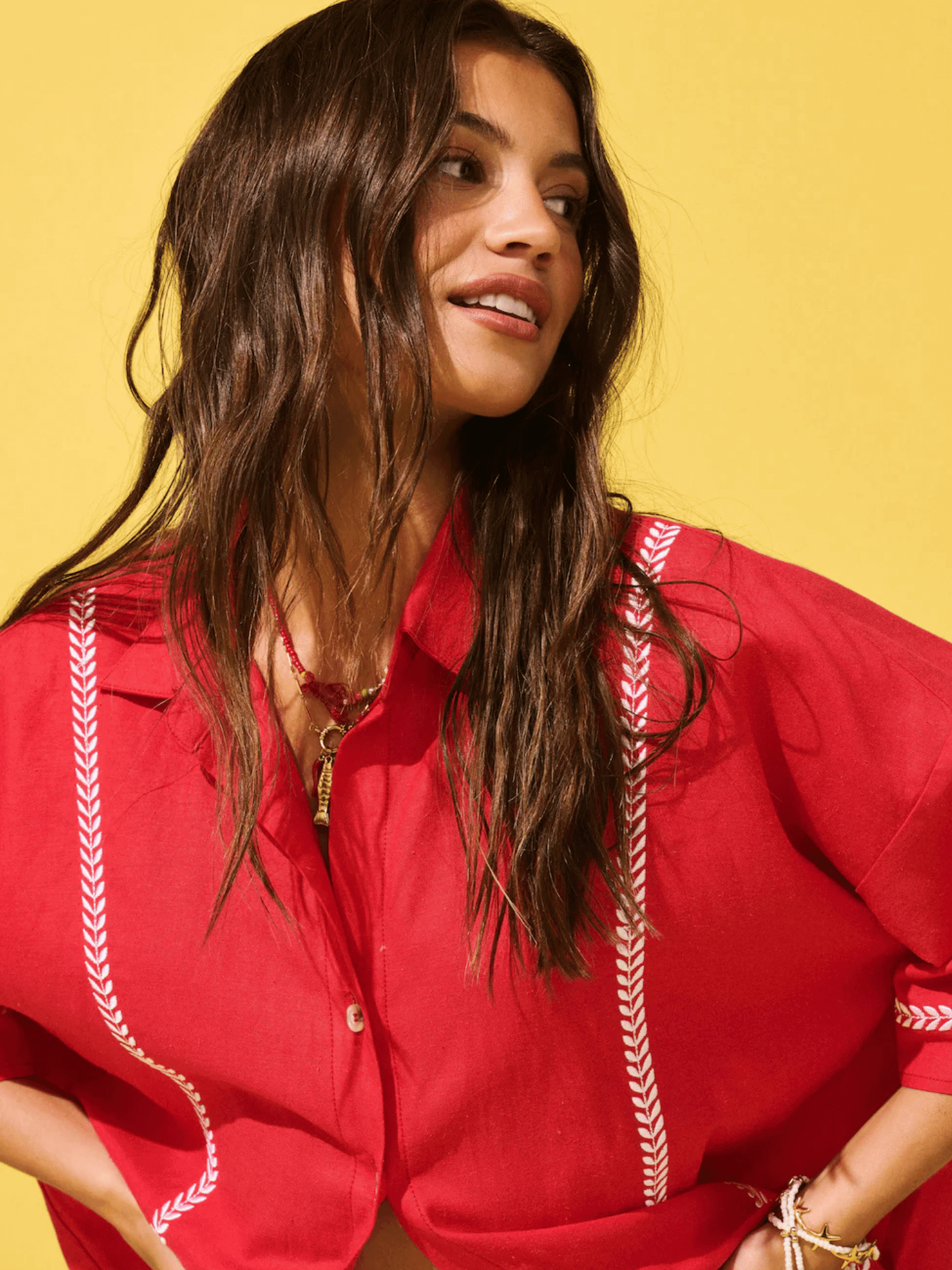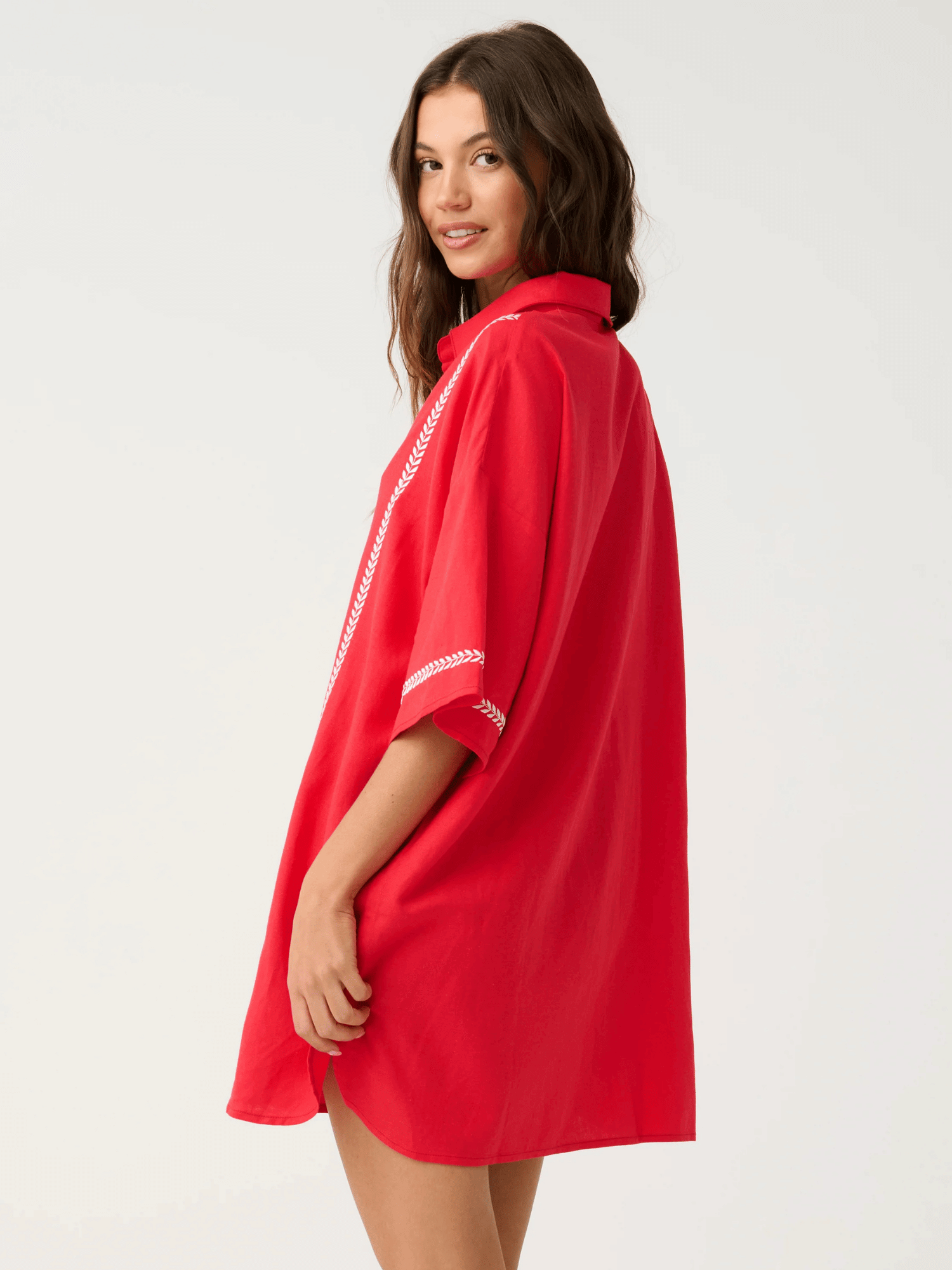 - Contrast white leaf embroidery along front and sleeve hem