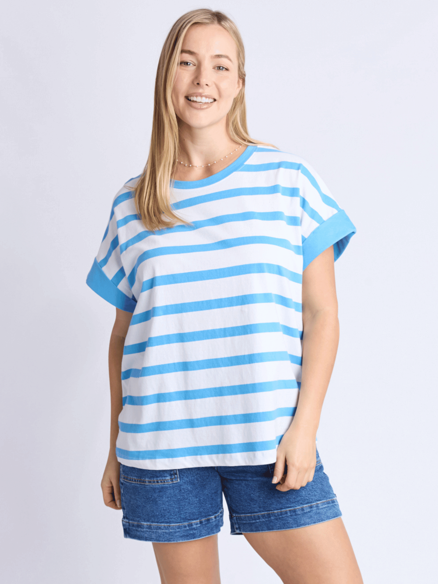 The Maddison Tee showcases a fun, (non functionable) button feature at the back. Its rolled cuff sleeves add a polished, casual detail, while the curved hem provides a flattering silhouette.