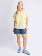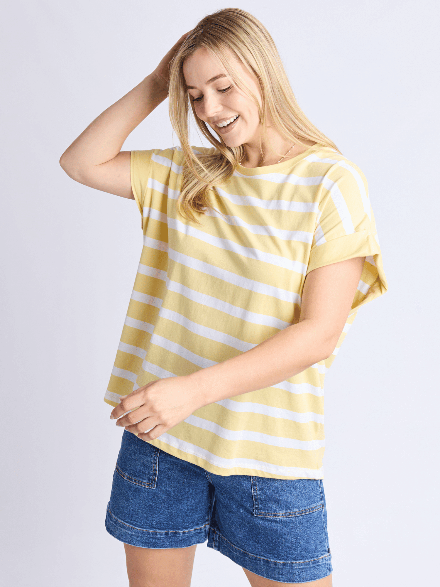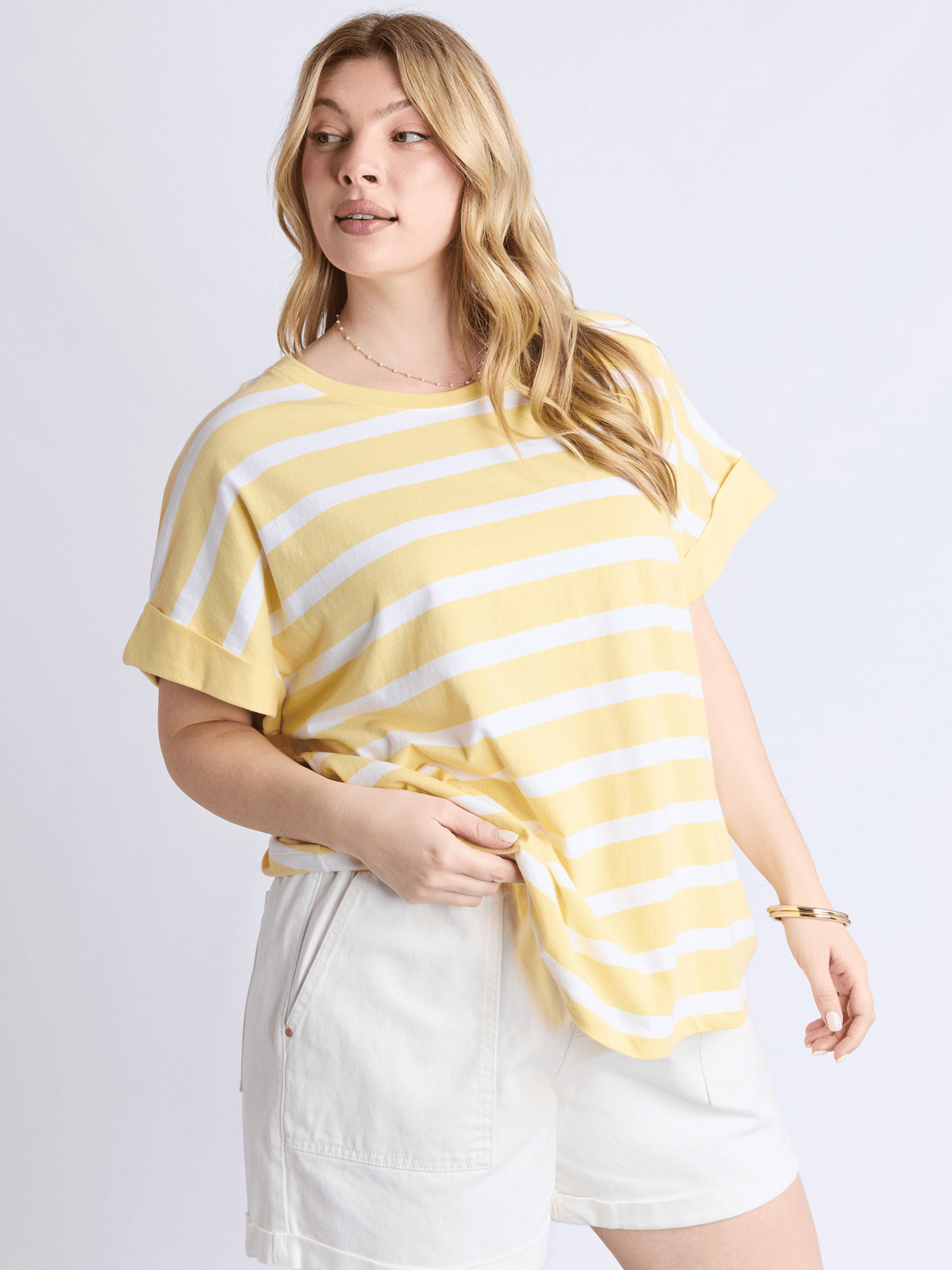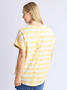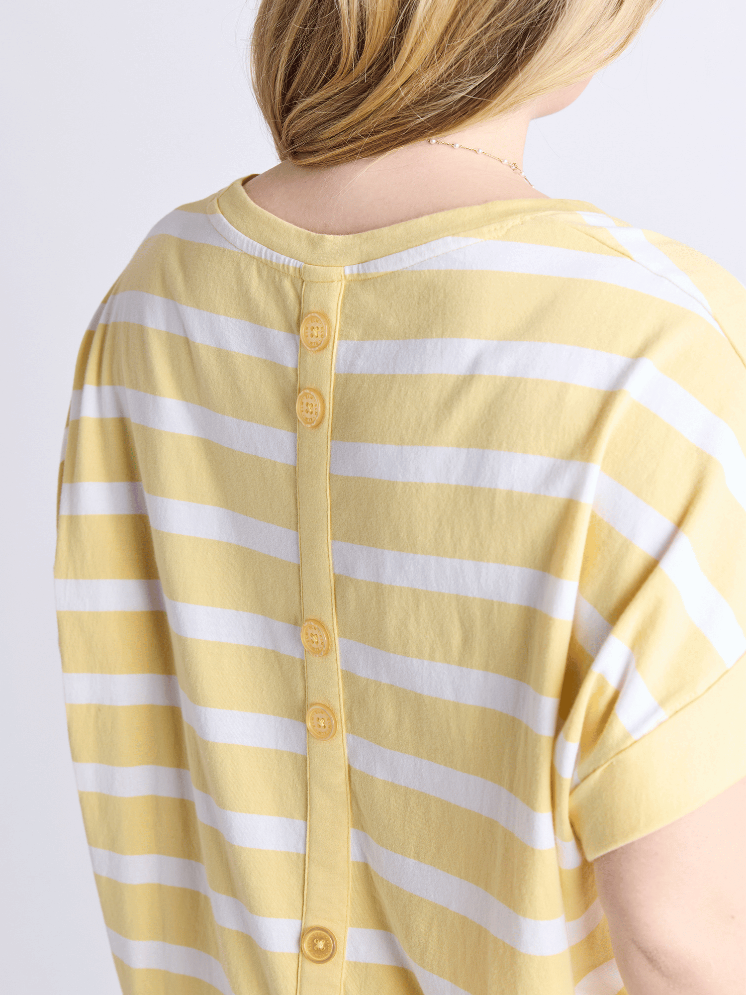 The Maddison Tee showcases a fun, (non functionable) button feature at the back. Its rolled cuff sleeves add a polished, casual detail, while the curved hem provides a flattering silhouette.