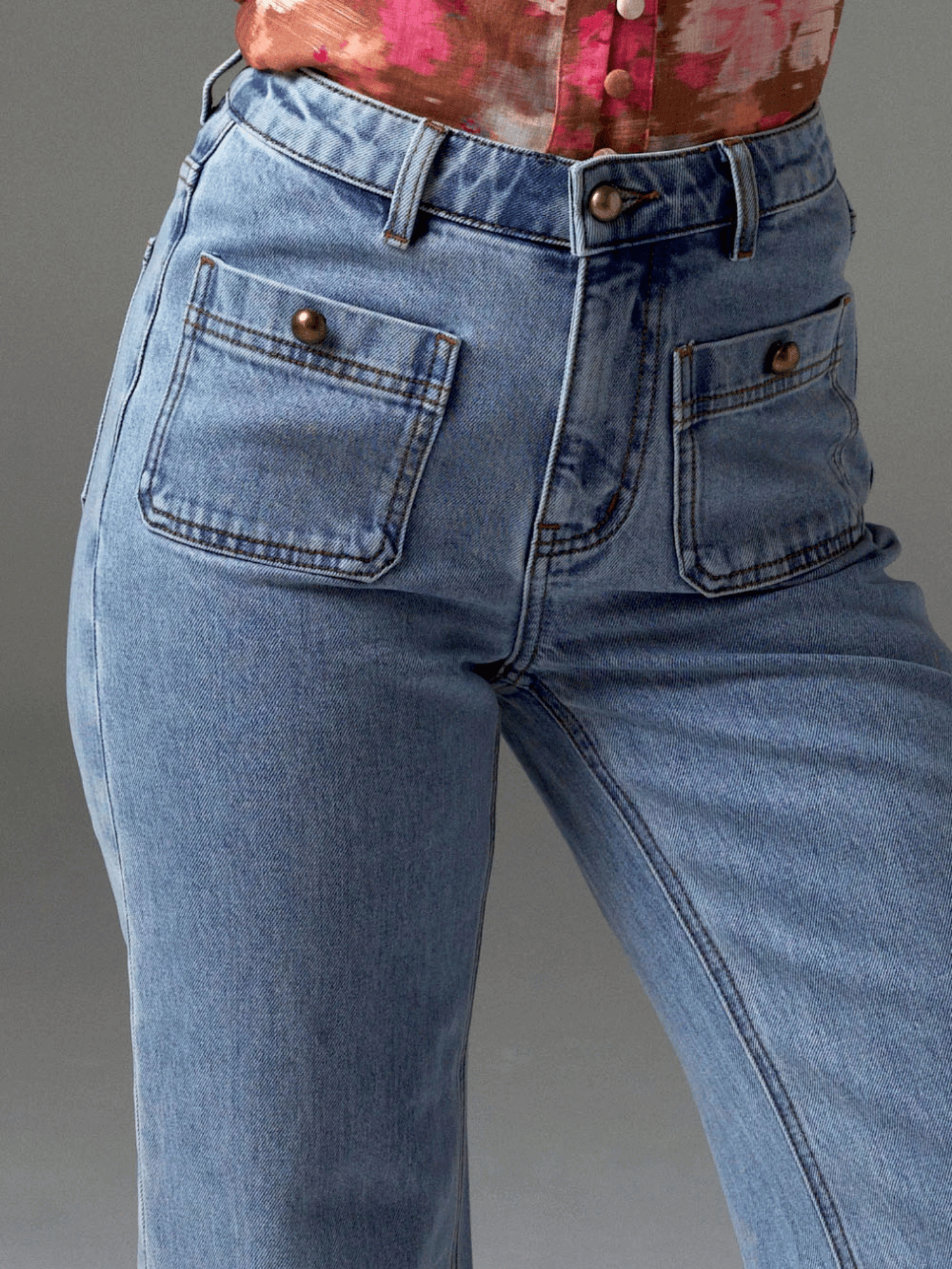 - Brass domed buttons on curved front pockets for vintage-inspired detail