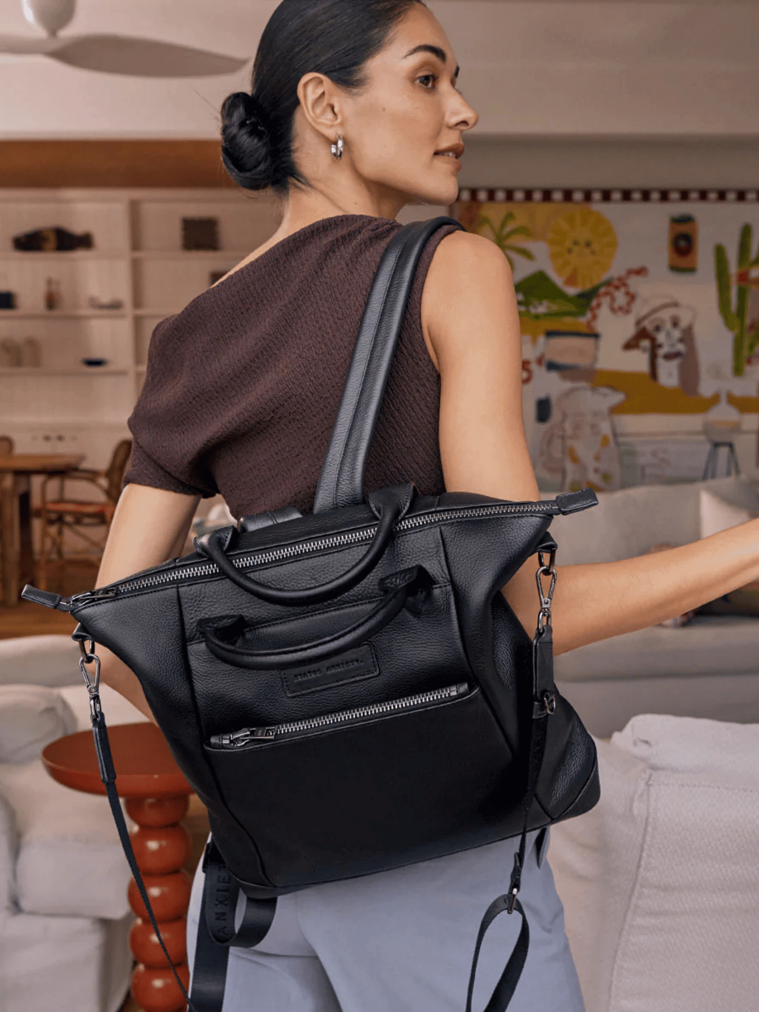 Made in response to the (very) popular request to make a smaller size version of our best selling 'Comes In Waves' bag. Mini Waves is the perfect uni or work bag with a wide opening top, space for your laptop and multiple compartments to keep everything in its place. Carry in hand with the top straps, over the body with the long webbed strap (included), or on your back with the shoulder straps. Big enough to carry everything you need, not too big to slow you down.
