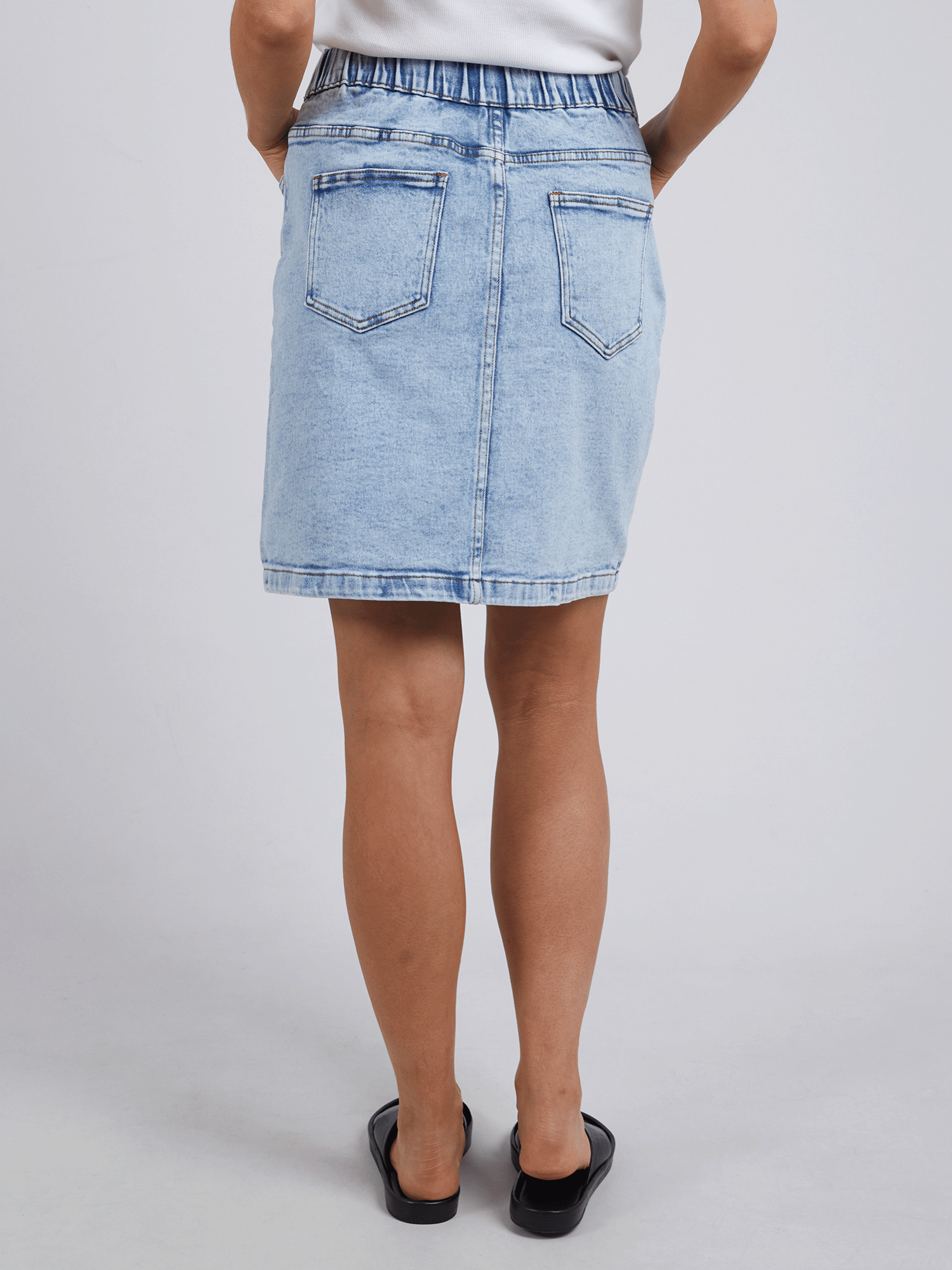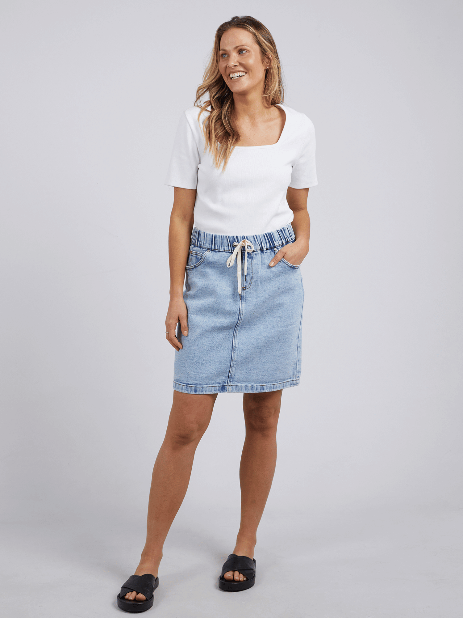 Comfort and style with this little denim skirt. With a super stretchy fit and drawcord for cinching in at the waist, this is the best little denim skirt you'll ever wear!